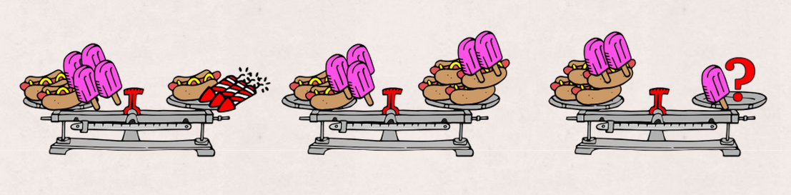 First, convert each scale to an equation where hotdogs = x, popsicles = y, and fireworks = z: